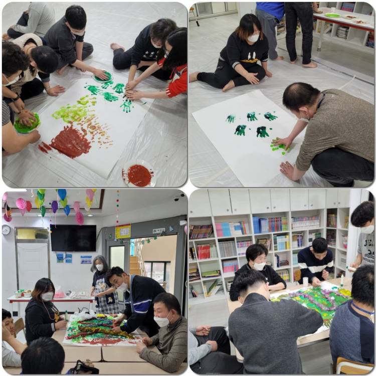미술치료 자체프로그램 시간 다함께 손도장을 찍으며 트리를 만들어 봅니다.